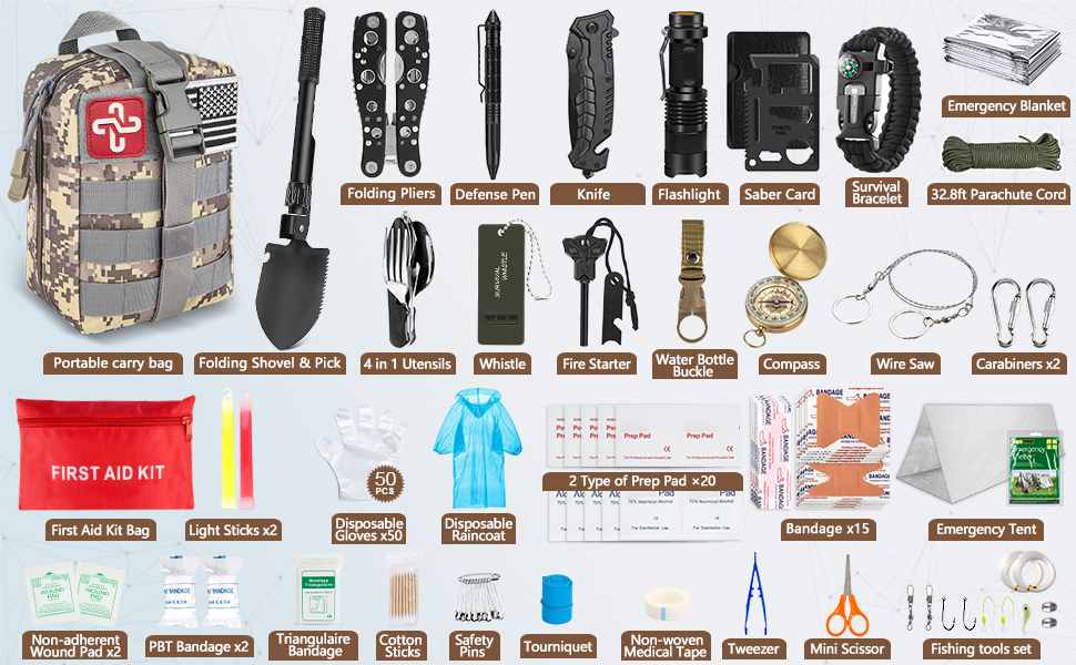 De 238-delige Emergency Survival Kit en EHBO-kit is ontworpen voor wandelaars, kampeerders, reddingsteams en iedereen die zich voorbereidt op onverwachte noodsituaties buitenshuis. Er wordt gebruik gemaakt van duurzame, weerbestendige materialen en van professionele kwaliteit componenten, ditkit biedt essentiële hulpmiddelen voor overleving, navigatie, eerste hulp en noodsignalering.