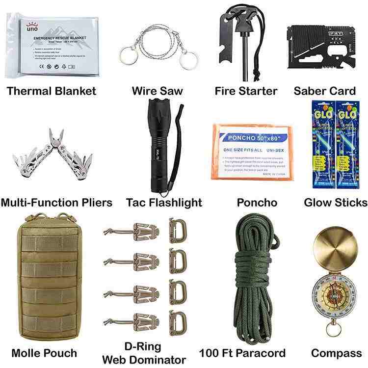 De Military Tactical 72H Emergency Survival Kit bevat medische EHBO-benodigdheden en praktische hulpmiddelen voor buitenreizen, kamperen en andere scenario's, die voldoen aan de behoeften van medisch en buitenplezier. De noodoverlevingstas heeft een gesp die aan de riem of rugzak kan worden gehangen, waardoor hij gemakkelijk te dragen is. Interne compartimenten voor gemakkelijke toegang.
